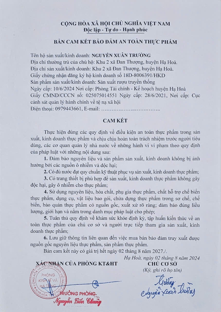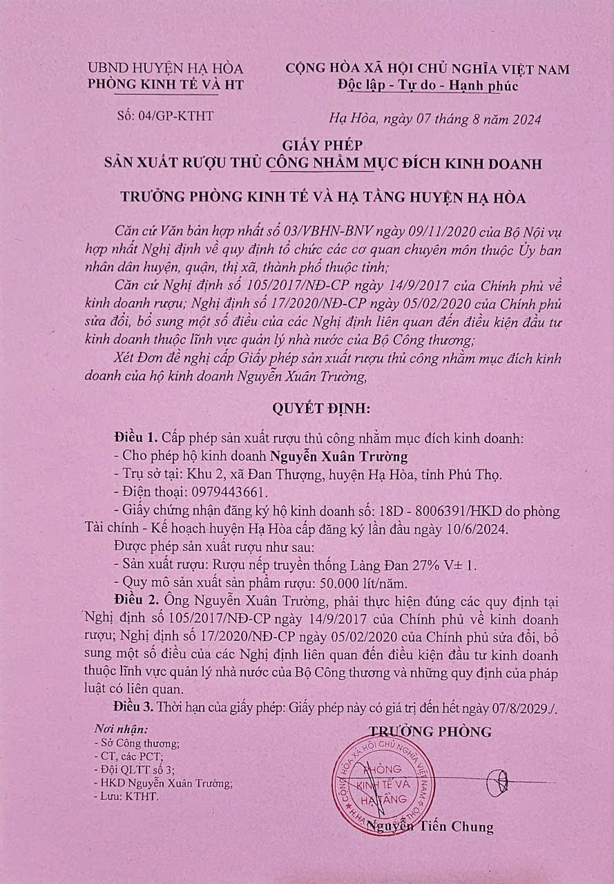 Làng Đan, với truyền thống nấu rượu lâu đời, nay đã được cấp giấy đăng ký kinh doanh, giấy phép sản xuất rượu và bản cam kết sản xuất đúng quy định, tạo điều kiện thuận lợi để mở rộng quy mô sản xuất một cách hợp pháp và bền vững. Việc hoàn thiện đầy đủ các thủ tục pháp lý không chỉ khẳng định uy tín của sản phẩm rượu làng Đan mà còn mở ra cơ hội đưa rượu truyền thống vào các hệ thống phân phối lớn, đảm bảo nguồn gốc rõ ràng và chất lượng ổn định. Nhờ đó, năng lực sản xuất của làng được nâng cao, góp phần phát triển kinh tế địa phương, đồng thời gìn giữ và lan tỏa giá trị văn hóa đặc trưng qua từng giọt rượu quê hương.